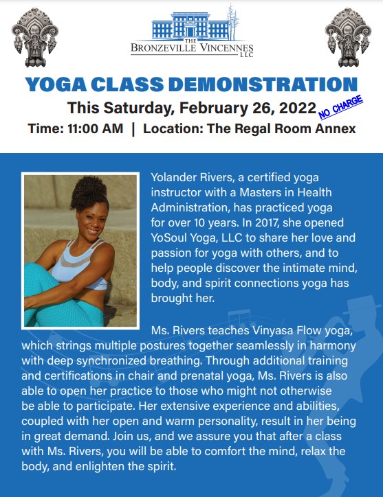 On February 26, 2022, The Bronzeville Vincennes was honored to welcome Yolanda Rivers, owner of YoSoul Yoga, to share a sample of her meaningful and invigorating form of vinyasa flow yoga. It remains to be seen whether Ms Rivers will become a regular around the TBV, but, regardless, those who attended her sample class were deeply moved by her practice.
